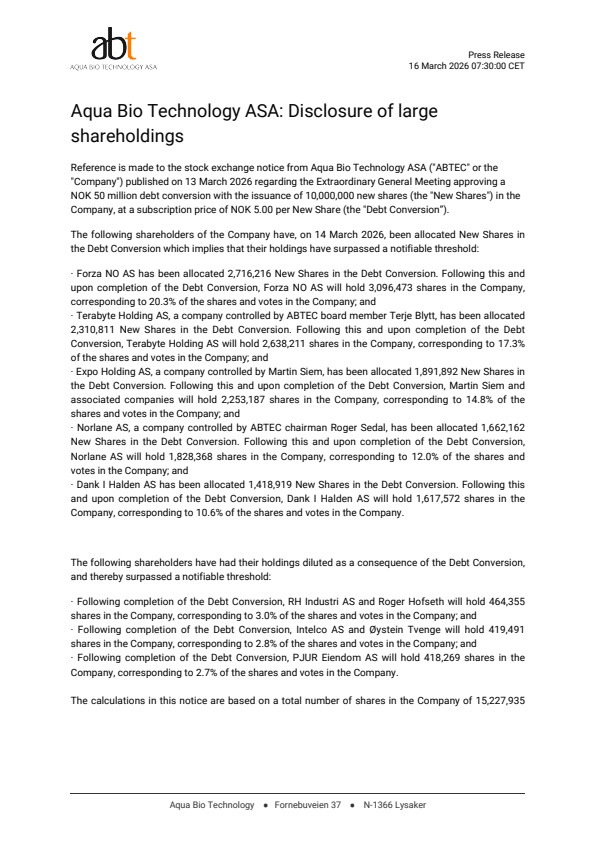 Reference is made to the stock exchange notice from Aqua Bio Technology ASA (“ABTEC” or the “Company”) published on 13 March 2026 regarding the Extraordinary General Meeting approving a NOK 50 million debt conversion with the issuance of 10,000,000 new shares (the “New Shares”) in the Company, at a subscription price of NOK 5.00 per New Share (the “Debt Conversion”).