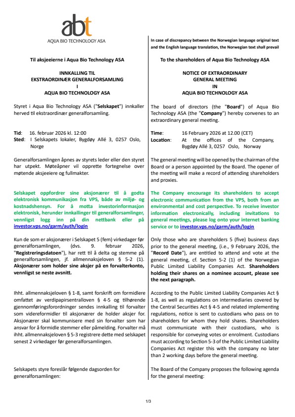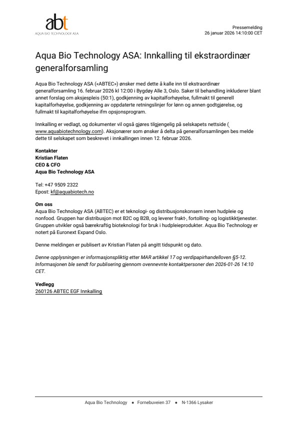 Aqua Bio Technology ASA («ABTEC») ønsker med dette å kalle inn til ekstraordinær generalforsamling 16. februar 2026 kl 12:00 i Bygdøy Alle 3, Oslo. Saker til behandling inkluderer blant annet forslag om aksjespleis (50:1), godkjenning av kapitalforhøyelse, fullmakt til generell kapitalforhøyelse, godkjenning av oppdaterte retningslinjer for lønn og annen godtgjørelse, og fullmakt til kapitalforhøyelse ifm opsjonsprogram.