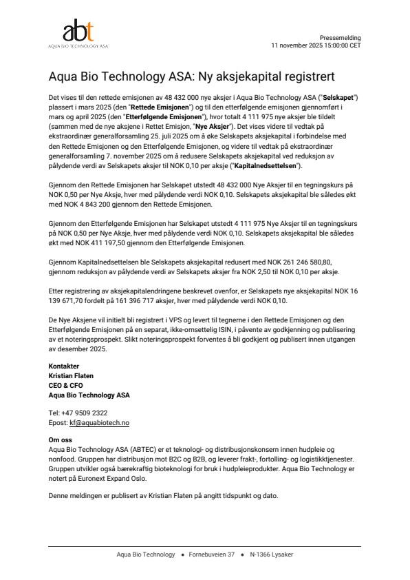Det vises til den rettede emisjonen av 48 432 000 nye aksjer i Aqua Bio Technology ASA (“Selskapet“) plassert i mars 2025 (den “Rettede Emisjonen“) og til den etterfølgende emisjonen gjennomført i mars og april 2025 (den “Etterfølgende Emisjonen“), hvor totalt 4 111 975 nye aksjer ble tildelt (sammen med de nye aksjene i Rettet Emisjon, “Nye Aksjer“). Det vises videre til vedtak på ekstraordinær generalforsamling 25. juli 2025 om å øke Selskapets aksjekapital i forbindelse med den Rettede Emisjonen og den Etterfølgende Emisjonen, og videre til vedtak på ekstraordinær generalforsamling 7. november 2025 om å redusere Selskapets aksjekapital ved reduksjon av pålydende verdi av Selskapets aksjer til NOK 0,10 per aksje (“Kapitalnedsettelsen“).